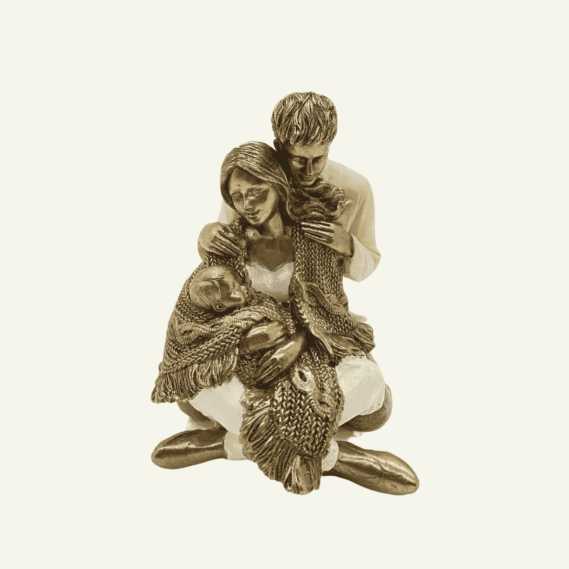 La «Abbraccio Infinito» es una representación sublime del amor familiar, capturada en una escena tierna y serena. Una madre sostiene a su bebé envuelto en una manta de textura suave, mientras el padre abraza a ambos con ternura y devoción. Las posturas relajadas y los gestos amorosos transmiten una sensación de paz y protección, mientras que el acabado en tonos dorados envejecidos y blancos perlados aporta calidez y elegancia a la composición. Esta pieza es un tributo visual a los lazos inquebrantables que unen a una familia.