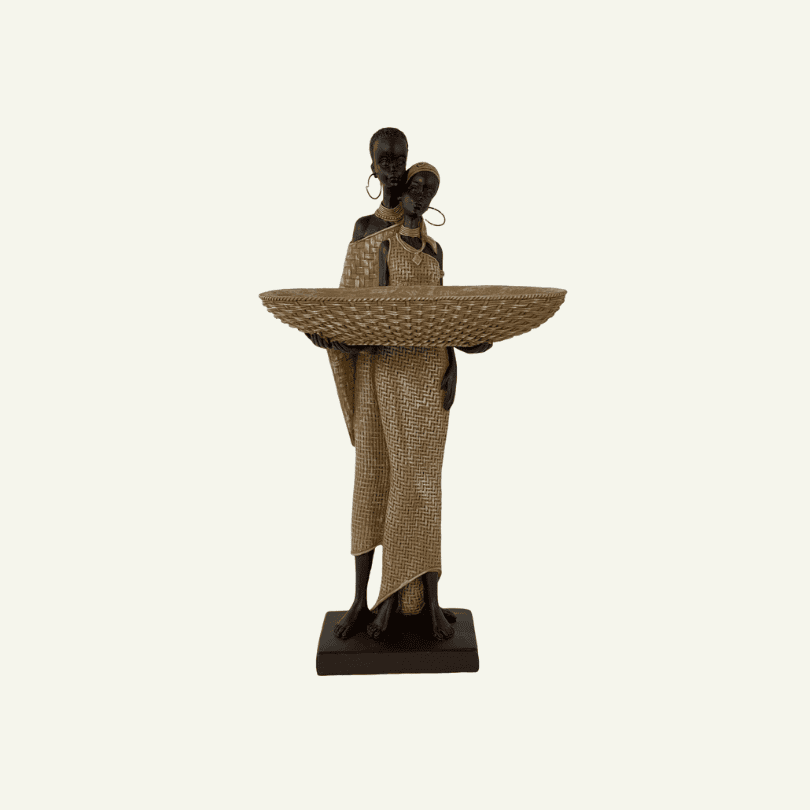 Una pieza artística que captura la esencia de la vida africana: dos figuras estilizadas, entrelazadas en una danza de ternura y solidaridad, sostienen un cuenco entre sus manos. Sus vestidos, con textura de fibras entretejidas, evocan la autenticidad de la cultura artesanal africana, mientras los aretes y collares dorados añaden un toque de distinción. Una escultura que transmite belleza, conexión y herencia.