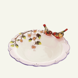 Su diseño refinado presenta un borde festoneado en lila perlado, cuidadosamente detallado para evocar la suavidad de los amaneceres florales. En la parte superior, un delicado ramillete de flores de cerezo se extiende como símbolo de renovación y belleza efímera, acompañado por un encantador par de pájaros en tonos vibrantes, modelados con precisión para aportar dinamismo y romanticismo a la pieza.