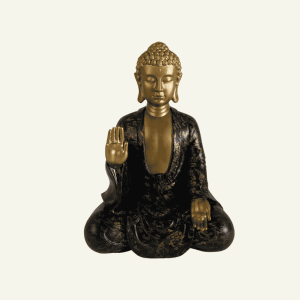 La figura Buddha Dorato in Benedizione irradia calma y sabiduría a través de su gesto de la mano elevada en mudra de bendición. Esta pieza está finamente trabajada en resina con un acabado negro profundo, decorado con sutiles detalles florales en dorado que realzan la belleza y majestuosidad del conjunto. El contraste entre el dorado del rostro y las manos, y el intrincado diseño del atuendo, evocan una presencia serena y llena de simbolismo.