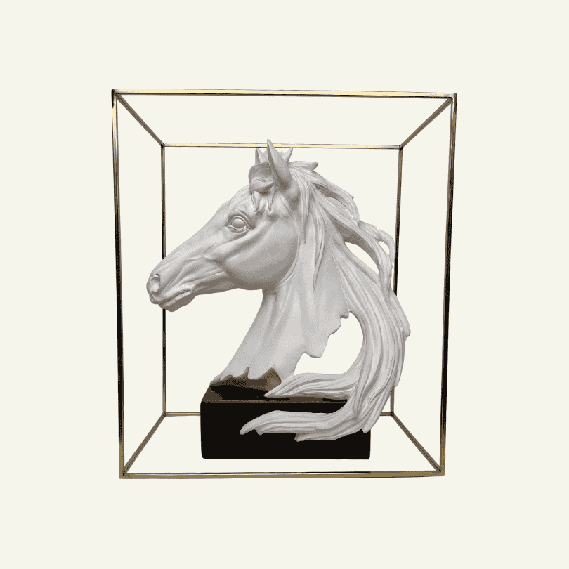 El “Cavallo Aereo” es una pieza que fusiona arte escultórico y diseño moderno. Con una cabeza de caballo tallada en resina blanca de acabado suave, encerrada en un marco cúbico de hierro dorado, esta obra genera una sensación de ligereza y libertad. Sus líneas fluidas evocan movimiento, mientras la estructura geométrica equilibra la composición con una estética minimalista y sofisticada.