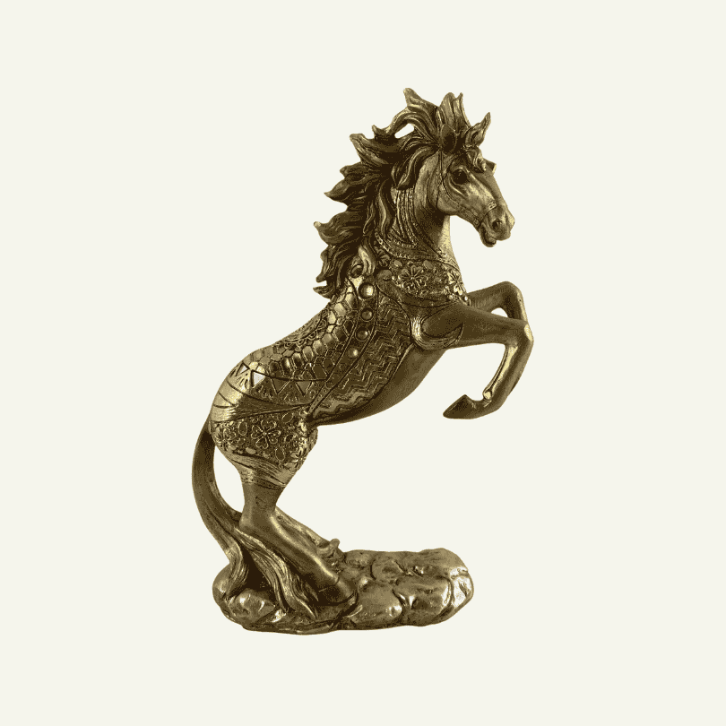 La «Cavallo Imperioso» es una escultura que encarna la fuerza majestuosa de un caballo encabritado, con su postura enérgica y desafiante. Esta pieza, vestida con una armadura ornamental de intrincados grabados florales y arabescos, evoca la nobleza de los caballos de guerra, símbolos de poder y elegancia. El acabado en dorado envejecido aporta un toque clásico y atemporal, destacando cada detalle de su textura rica y su melena ondeante, que parece cobrar vida en medio del movimiento.