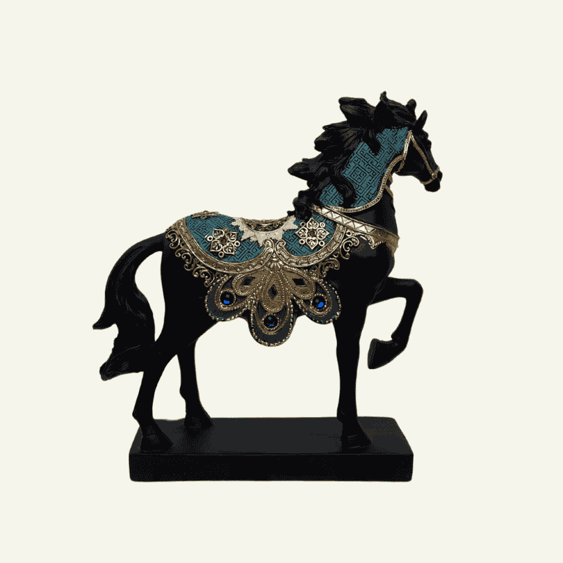 El Cavallo Maestoso es una obra maestra que encapsula el espíritu de la nobleza ecuestre. Con su elegante porte y una silla de montar ornamentada con patrones barrocos, detalles dorados y gemas azul profundo, esta figura evoca el esplendor de las caballerías imperiales. Ideal para espacios que buscan transmitir poder, sofisticación y tradición.