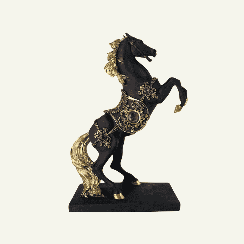 Escultura de caballo encabritado, con detalles ornamentales en dorado y piedras decorativas.