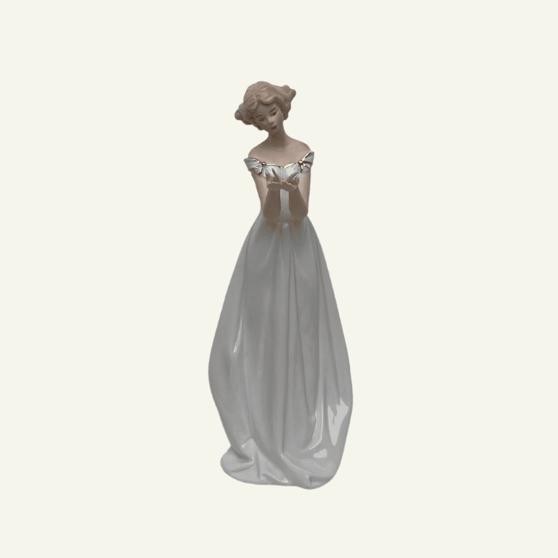 La figura Farfalla Bianca transmite una delicadeza poética. Una dama de largos pliegues cerámicos sostiene con ternura una mariposa entre sus manos, como símbolo de transformación, belleza y paz interior. Sus acabados suaves, la paleta neutra y la expresión serena la convierten en una pieza perfecta para decorar con sensibilidad.