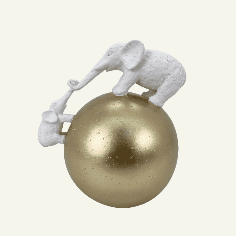 Una pieza decorativa que captura ternura, equilibrio y conexión. Elefanti in Equilibrio representa a dos elefantes en una escena conmovedora: uno sostiene con su trompa al otro, que pende del borde de una esfera dorada. Más que un adorno, esta escultura cuenta una historia de apoyo mutuo y confianza, transformándose en un símbolo poderoso dentro del hogar.