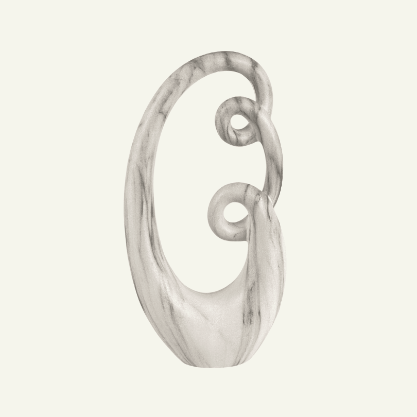 Inspirada en la danza del viento y las formas orgánicas que fluyen sin esfuerzo, la escultura Vortice di Calma combina equilibrio, movimiento y serenidad en una sola pieza. Con un acabado marmolado en tonos neutros, esta figura decorativa evoca elegancia escultórica y una sensación de calma suspendida.