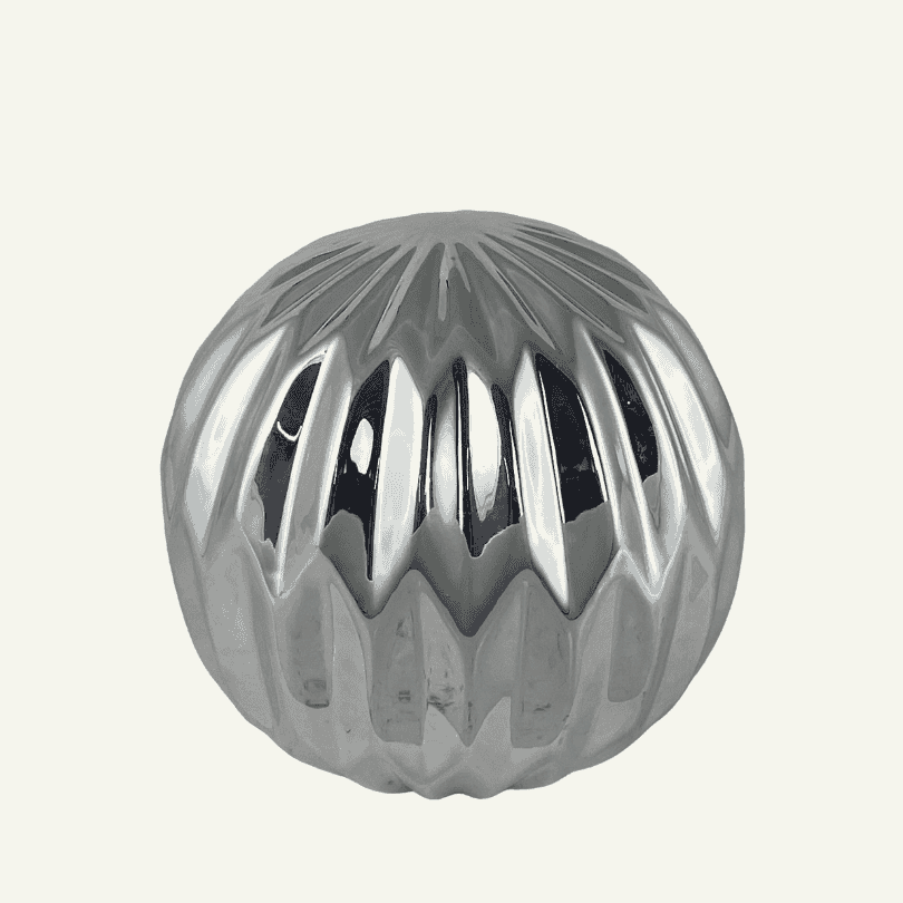 “Sfera Lucida” es una pieza ornamental de forma esférica con un diseño acanalado y acabado cromado que irradia sofisticación. Su superficie espejada y ondulaciones simétricas evocan una flor abstracta o una joya escultórica, creando juegos de luz que realzan la estética del entorno.