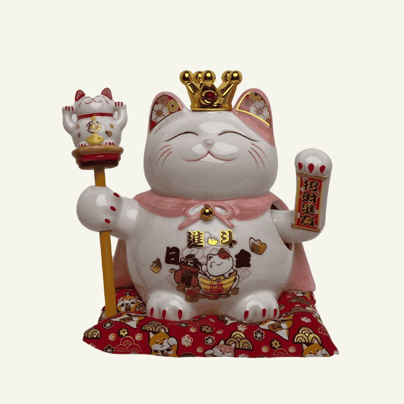 Este majestuoso “Gato de la Fortuna” combina tradición, optimismo y un diseño encantador digno de la realeza oriental. Vestido con una capa rosada, cetro simbólico y corona dorada, está listo para atraer la prosperidad a donde sea que lo coloques.
