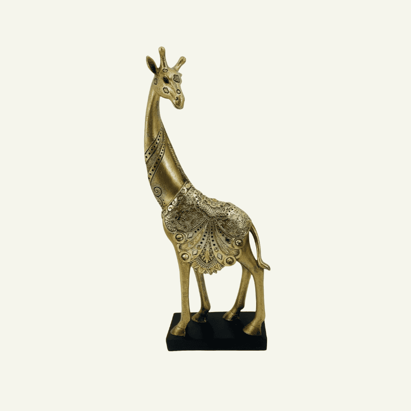 La «Giraffa Regale» es una figura decorativa que combina la gracia natural de la jirafa con detalles artísticos en relieve. Sus líneas alargadas, el cuello elegante y la postura atenta evocan la nobleza de este animal, mientras que los adornos florales en dorado envejecido le otorgan un aire de sofisticación y exotismo. Esta pieza está pensada para ser el punto focal de cualquier espacio, destacando por su altura y su acabado refinado.