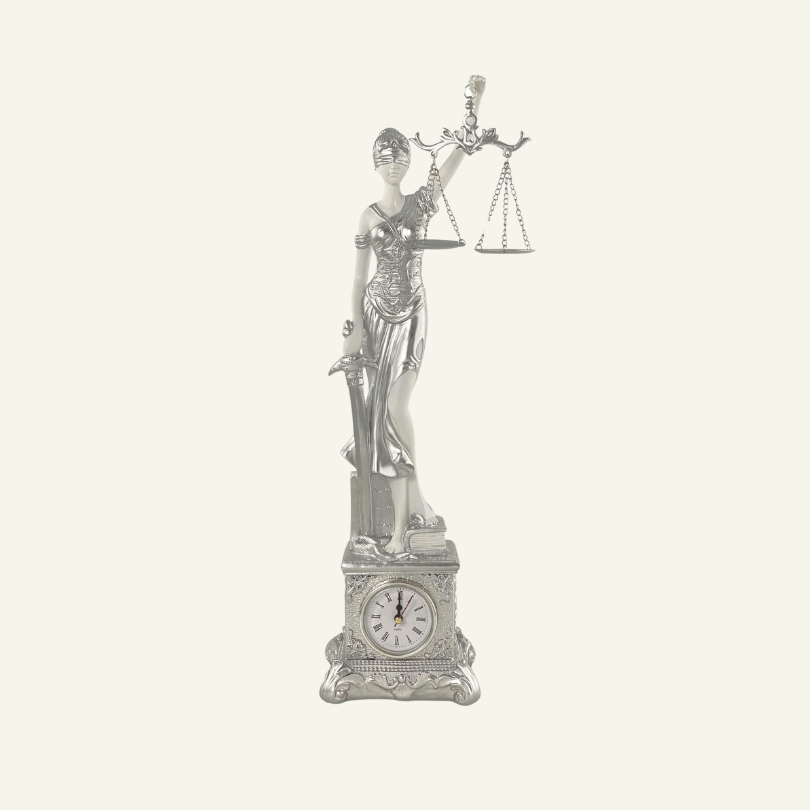 La escultura Giustizia Regale captura con majestuosidad la figura clásica de la Dama de la Justicia, esta vez elevada sobre una base ornamentada que incorpora un reloj funcional, símbolo del imperativo legal de actuar a tiempo. Esta pieza no solo impone por su altura y presencia visual, sino que también transmite sobriedad, rigor y elegancia en ambientes formales o institucionales.