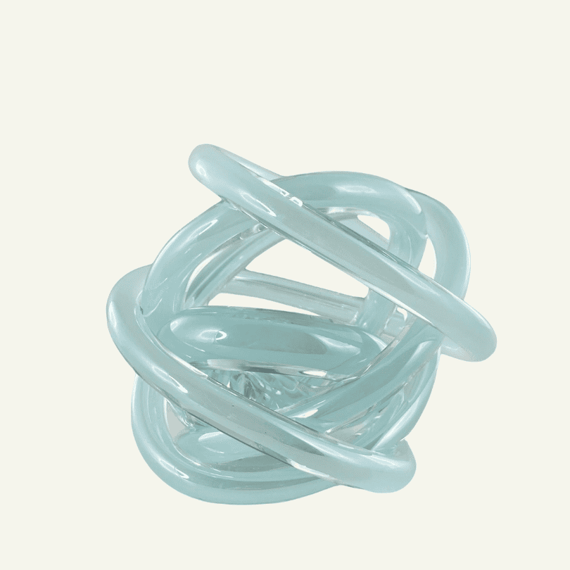 La escultura Nodo Celeste presenta una elegante forma entrelazada en vidrio translúcido azul claro, evocando serenidad, continuidad y sofisticación. Este objeto decorativo moderno es ideal para añadir una nota de diseño contemporáneo y aireado a cualquier ambiente.