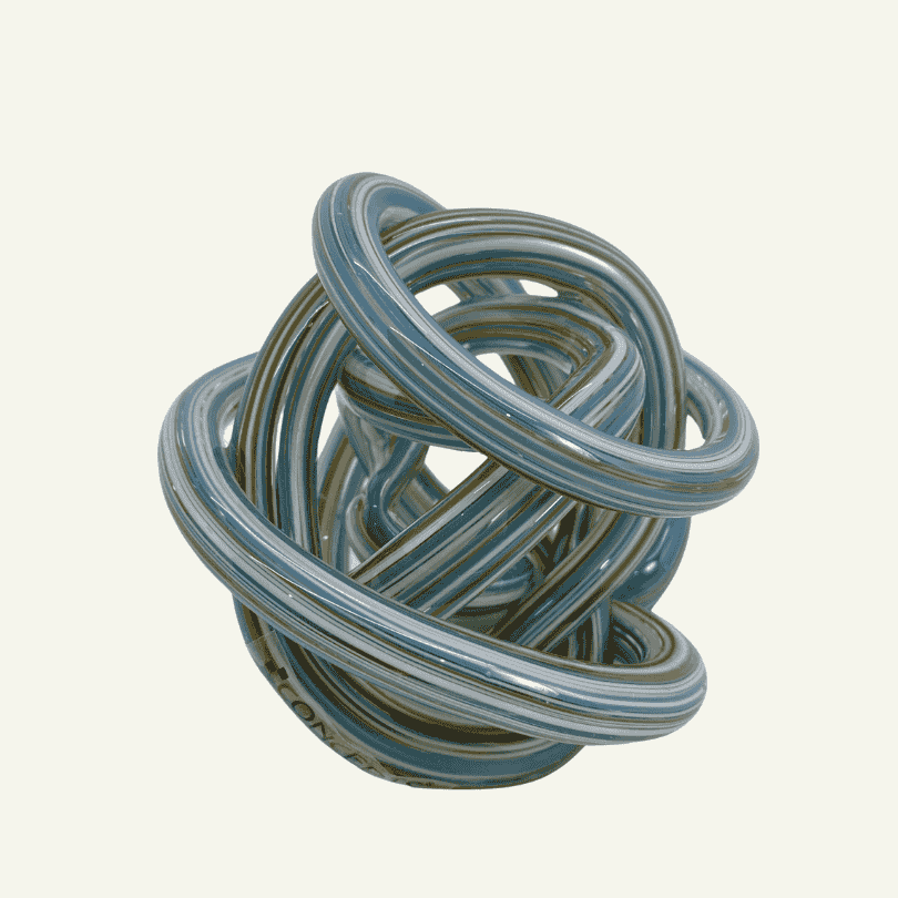 El Nodo Marino es una escultura decorativa compacta y elegante, elaborada en vidrio de tonos azulados con vetas internas que evocan el movimiento del océano. Su diseño trenzado lo convierte en un acento moderno ideal para espacios contemporáneos.