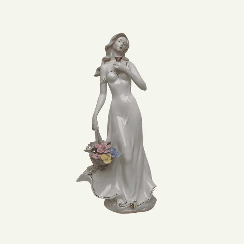 Una pieza clásica que evoca la elegancia y el encanto femenino. Signora dei Fiori (Señora de las Flores) muestra a una mujer de largo vestido blanco, sosteniendo un ramo de flores multicolor, con una delicada rosa en su pecho. Su expresión serena y su postura grácil convierten a esta figura en un símbolo de belleza atemporal.