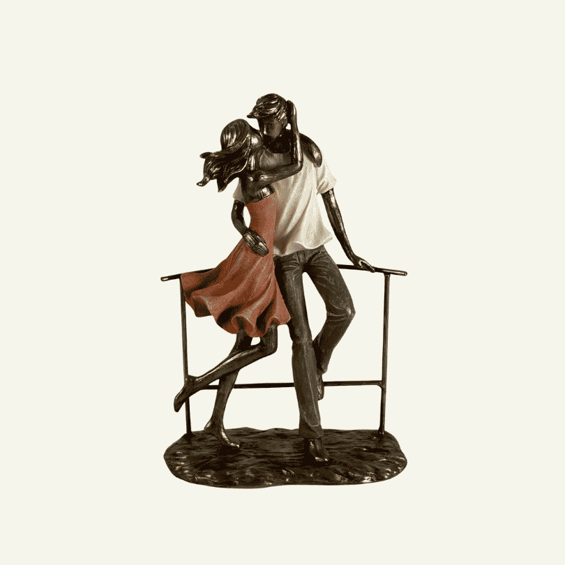 «Sospiri al Tramonto» es una escultura que captura la magia de un encuentro romántico al atardecer, donde el tiempo parece detenerse y la complicidad se hace palpable. La escena muestra a una pareja abrazada, apoyada sobre una barandilla simbólica, mientras el vestido de la mujer, en un vibrante tono terracota, ondea con la brisa como un susurro de movimiento y pasión. El contraste entre los detalles oscuros y los colores suaves crea una pieza visualmente armoniosa, que transmite ternura, calidez y una historia de amor que trasciende el instante.