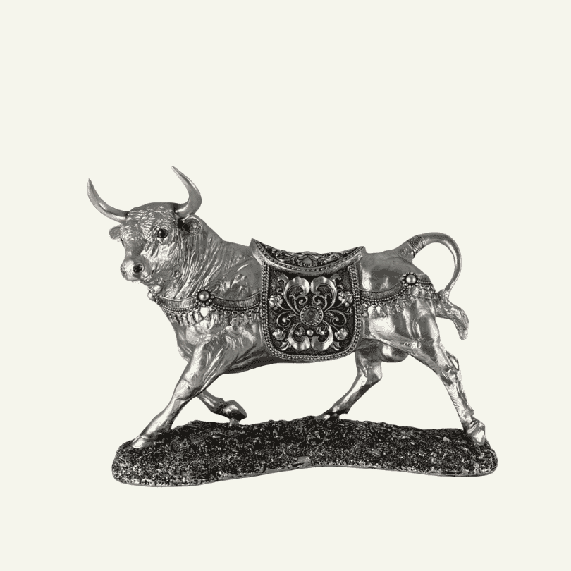 El «Toro Maestoso» es una escultura que encarna la fuerza y la elegancia de un toro en su máxima expresión. Su postura altiva, con la cabeza erguida y los cuernos curvados hacia el cielo, transmite un aire de dominio y nobleza. La ornamentación detallada sobre su lomo y flancos, inspirada en motivos florales y arabescos, aporta un toque de lujo refinado. El acabado en plata envejecida destaca cada relieve y da vida a la pieza, logrando un efecto visual sofisticado y atemporal.