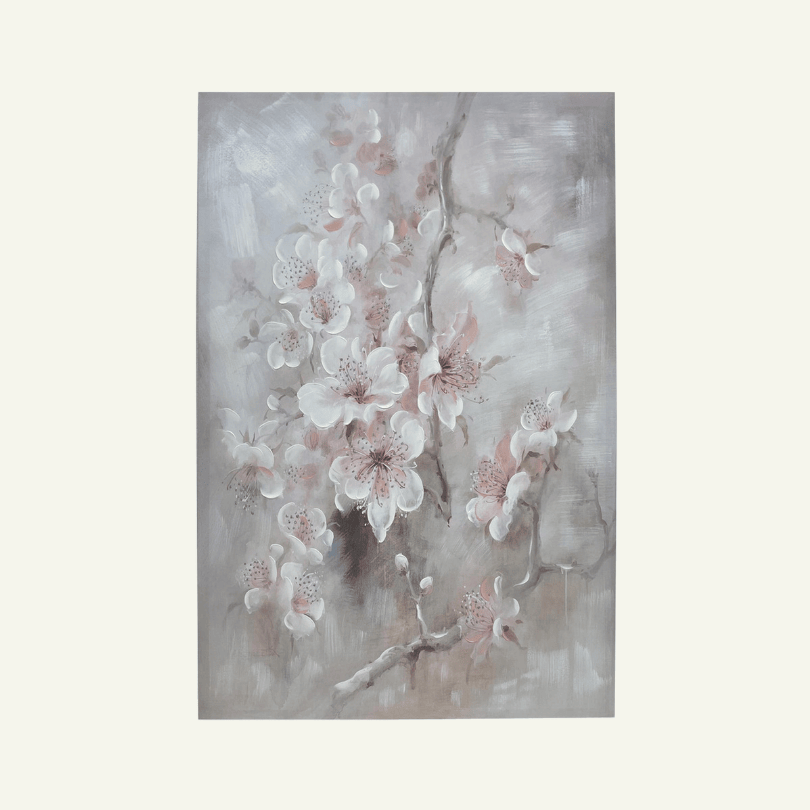 El cuadro “Fiori d’Albicocco” captura la delicadeza del florecer primaveral con una composición vertical de ramas de albaricoquero en plena floración. Su paleta suave en tonos rosados, blancos y grises lo convierte en una pieza serena, perfecta para transmitir calma y frescura en cualquier ambiente.