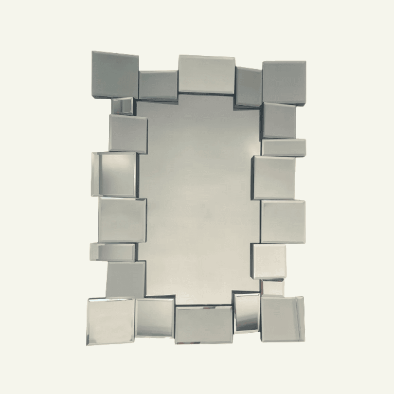 El espejo “Specchio Scomposto” presenta un diseño audaz con módulos plateados irregulares que enmarcan una superficie central clara y refinada. Es una pieza que juega con la fragmentación visual y la simetría dinámica, ideal para decoraciones vanguardistas y espacios con personalidad.