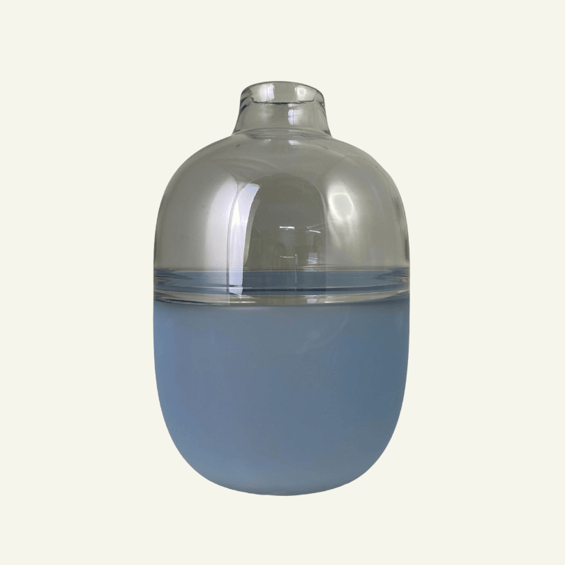 El florero “Cielo Doppio” combina la serenidad del azul celeste con la pureza del vidrio transparente, evocando la calma del horizonte dividido entre cielo y mar. Su silueta redondeada y cuello estrecho le otorgan un carácter equilibrado, ideal para ambientes contemporáneos con un toque poético.