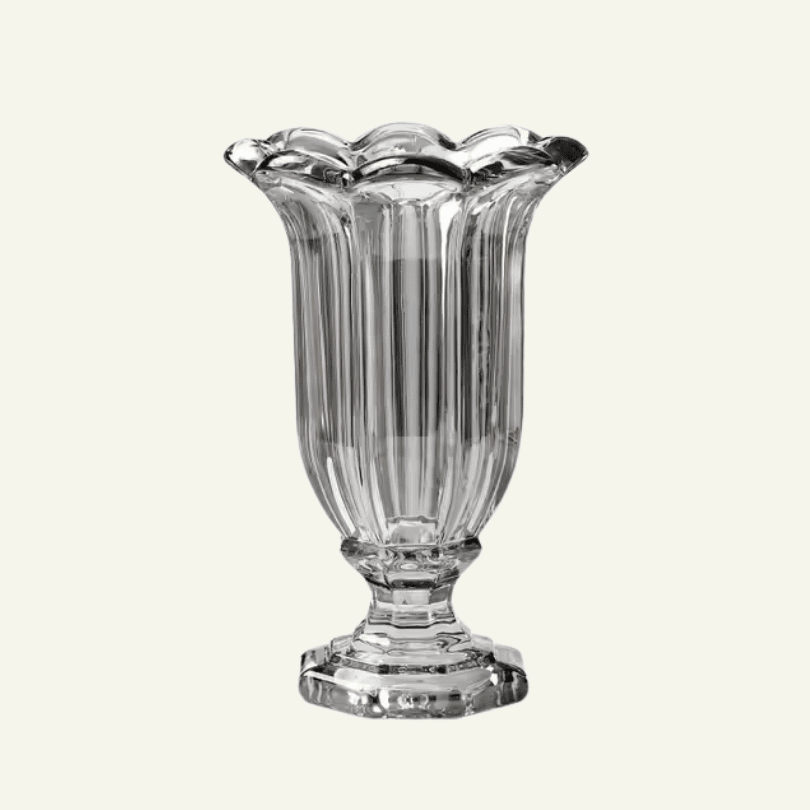 El “Fiore di Cristallo” es una pieza que evoca la elegancia de las vitrinas antiguas, con una silueta inspirada en las copas florales del barroco italiano. Su estructura vertical y transparente, trabajada con relieves verticales y base hexagonal, capta la luz con una armonía exquisita.