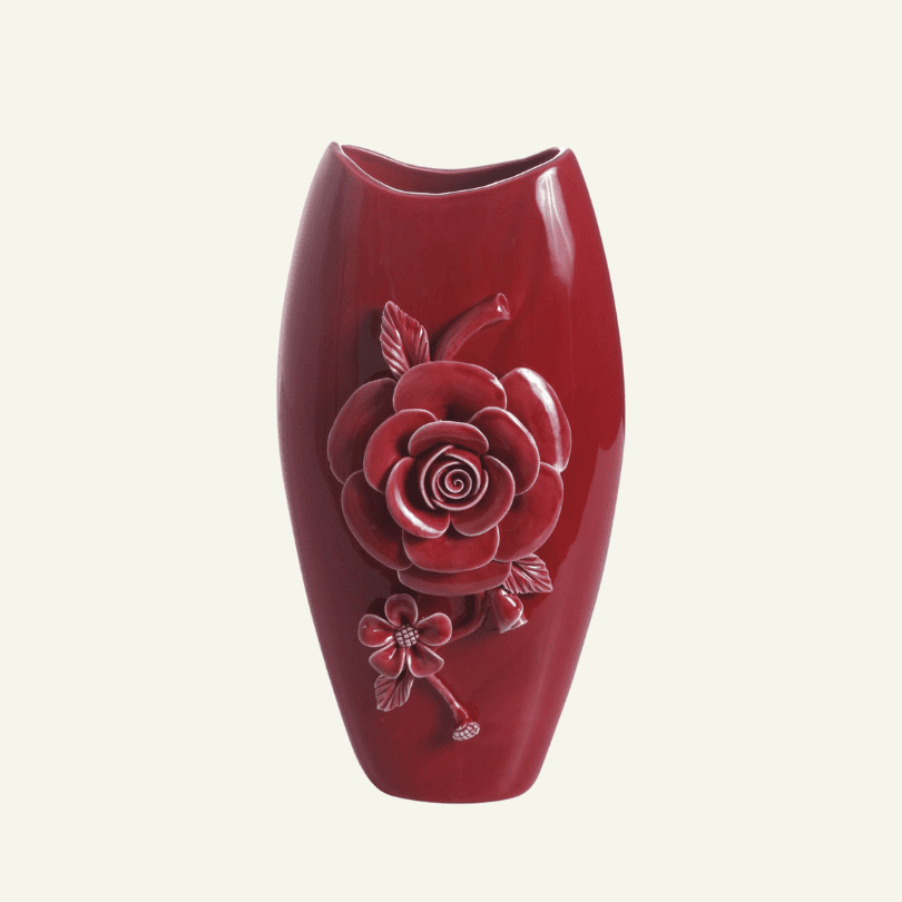 El florero “Fiore Incantato” es una pieza de impacto visual y encanto romántico. Su cuerpo ovalado, esmaltado en rojo profundo de alto brillo, se enriquece con un delicado motivo floral en relieve que añade volumen, textura y una sensación artesanal a su estética elegante.