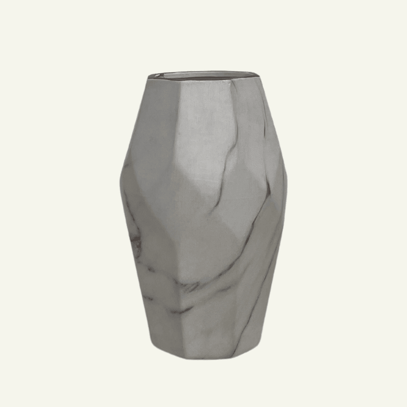 El jarrón “Pietra Scultorea” combina la nobleza del mármol con un diseño de líneas facetadas que evocan una escultura mineral. Su silueta irregular y su acabado en tonos grises marmolados lo convierten en una pieza contemporánea que transmite fuerza, equilibrio y estilo.
