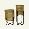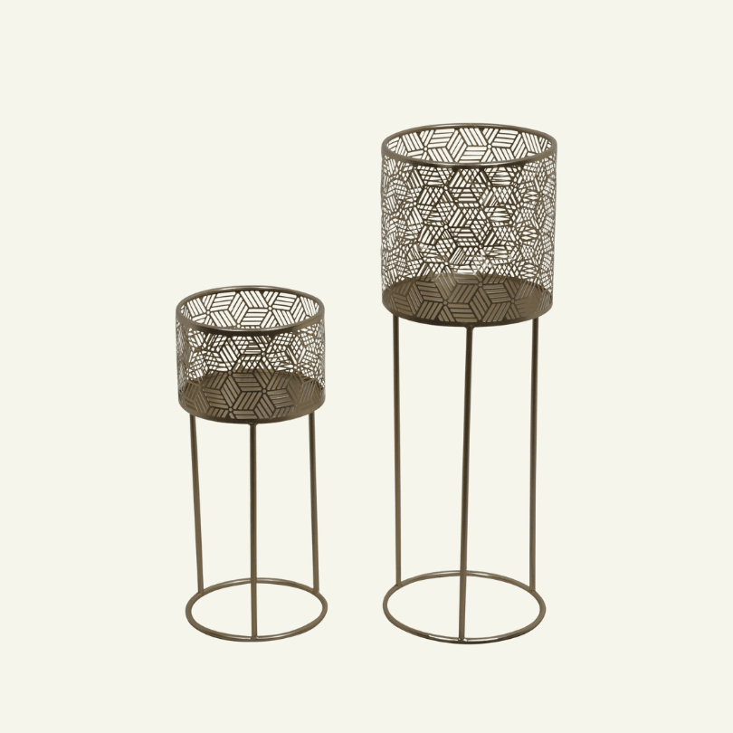 El set “Luce Geometrica” conjuga diseño contemporáneo con tradición ornamental. Cada pote metálico se sostiene sobre una base elevada y liviana, mientras el cuerpo calado en patrones geométricos hexagonales crea un juego de luces y sombras cuando se coloca cerca de una fuente de luz natural o artificial.
