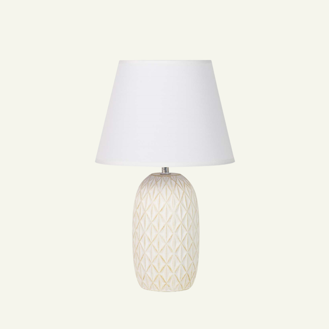 Una lámpara que fusiona elegancia minimalista con una textura inspirada en patrones geométricos naturales. El cuerpo de resina esculpida con relieve tipo diamante y su pantalla cónica blanca generan una atmósfera suave y serena, ideal para ambientes de lectura o descanso. Su tono blanco hueso aporta calidez visual y se adapta con facilidad a estilos nórdicos, mediterráneos o contemporáneos.