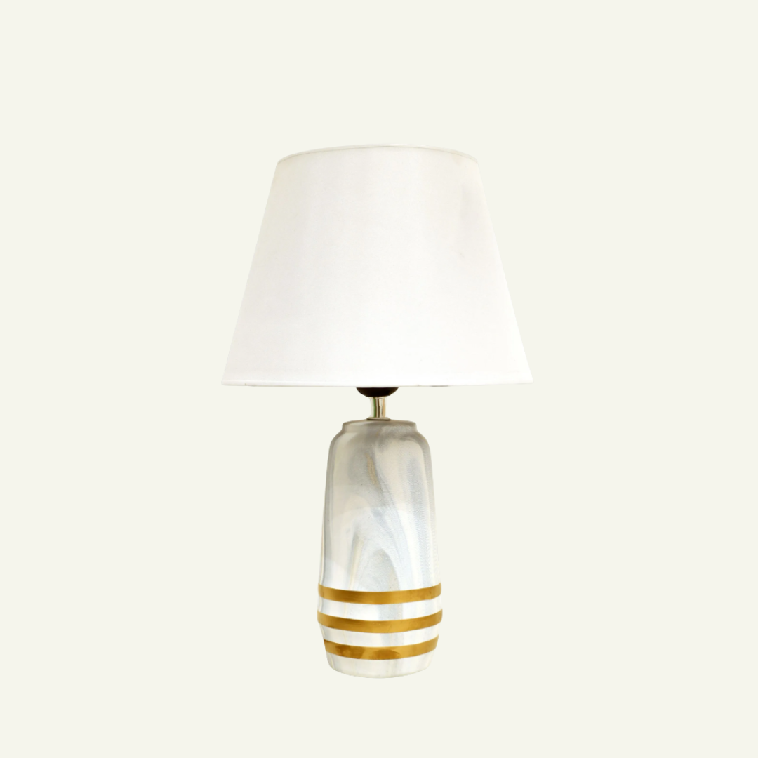 La lámpara “Strisce Dorate” combina elegancia moderna con detalles clásicos. Su base de cerámica esmaltada en tonos marfil presenta un sutil veteado efecto mármol que se realza con bandas doradas pintadas a mano. La pantalla cónica en tono blanco neutro suaviza la luz y complementa la estética sofisticada del conjunto.