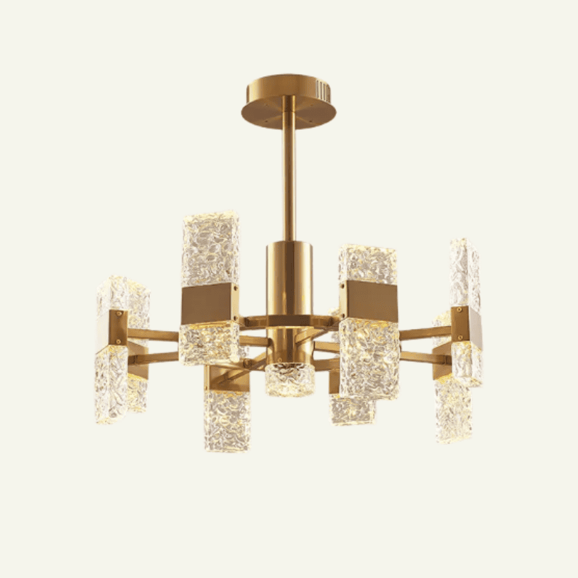 Con una estructura circular perfectamente proporcionada, “Forma Aurea” celebra el equilibrio entre materia y luz. Su diseño se compone de bloques de vidrio tallado que evocan el hielo fracturado, enmarcados por brazos metálicos en acabado dorado satinado. Cada módulo es una joya luminosa, esculpida para reflejar la luz con elegancia y fuerza.