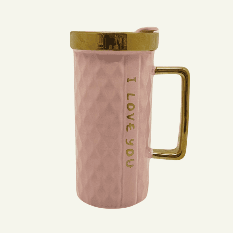 Celebra los pequeños grandes momentos con la taza con tapa “Amore Infinito”, una pieza de cerámica texturizada en tono rosa suave, acentuada con detalles dorados que evocan romance y elegancia moderna.