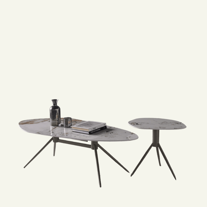 Inspirada en las formaciones naturales y la estética escandinava contemporánea, la mesa “Forma Roccia” conjuga la fortaleza mineral con una línea visual aerodinámica. Su tablero con acabado pétreo descansa sobre una estructura de acero minimalista, creando una pieza que impone presencia sin esfuerzo.