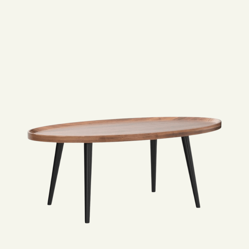 La “Ovale Grandioso” es una mesa de centro que destaca por su imponente formato ovalado, fabricada en MDF con acabado cálido tipo nogal. Sus líneas suaves y su base de patas cónicas negras evocan la estética escandinava más refinada, perfecta para ambientes contemporáneos que requieren equilibrio entre funcionalidad y diseño elegante.