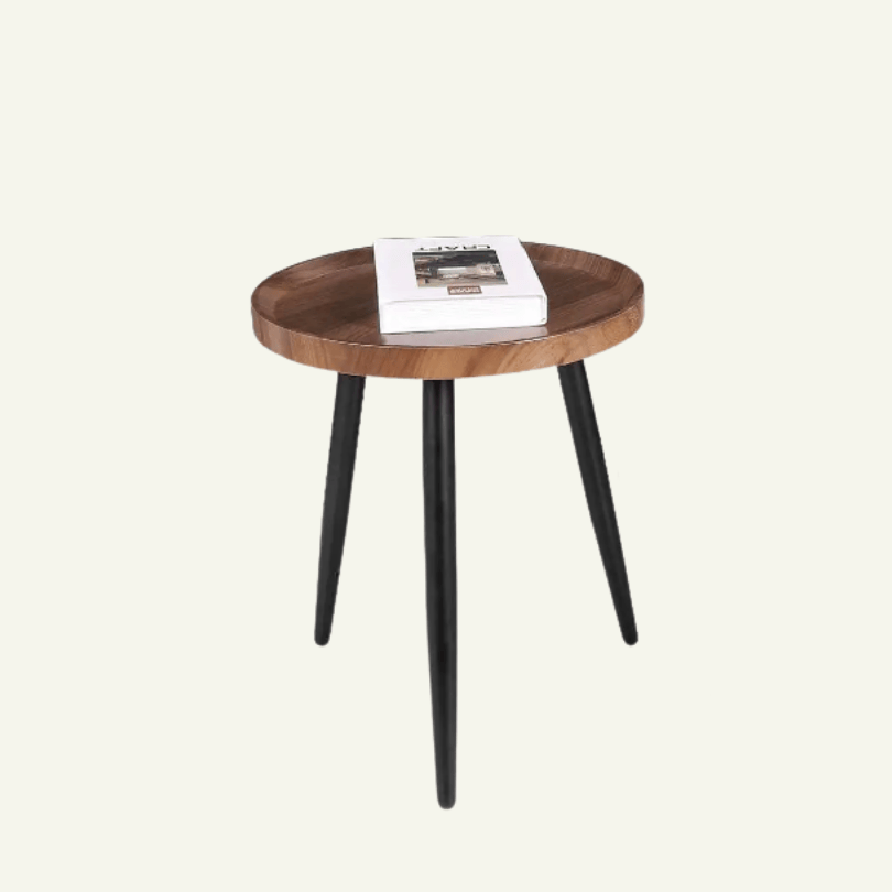 La “Trinità Rustica” es una mesa auxiliar de diseño limpio y cálido que combina la belleza de la madera MDF en acabado tipo nogal con patas negras de estructura cónica. Su silueta redonda con bordes elevados convierte esta pieza en una solución versátil, ideal para acompañar sofás, sillones o rincones decorativos con encanto natural.