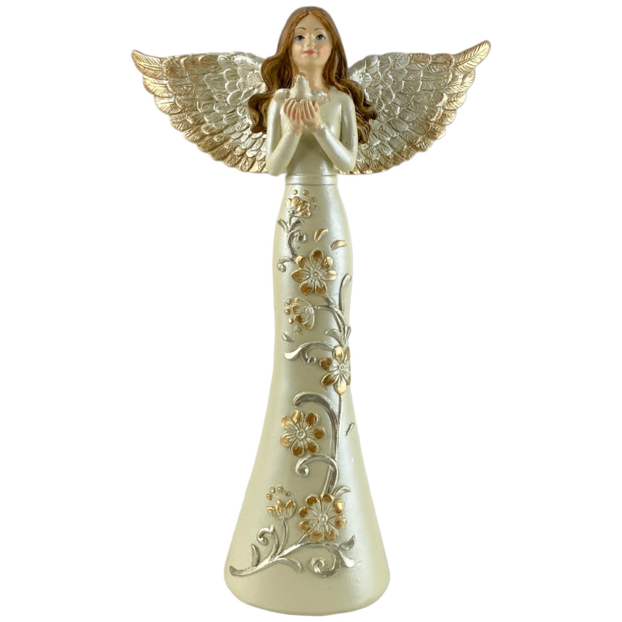 Dale un toque de distinción y espiritualidad a tu hogar con este Ángel Mujer Decorativo con Vestido Floreado en Tonos Dorados y Ave. Su diseño estilizado y elegante, con detalles florales en relieve y acabados dorados, lo convierten en una pieza única que resalta la armonía y la paz en cualquier espacio. El ave en sus manos simboliza la esperanza y la libertad, mientras que sus alas doradas aportan un brillo sutil y celestial.