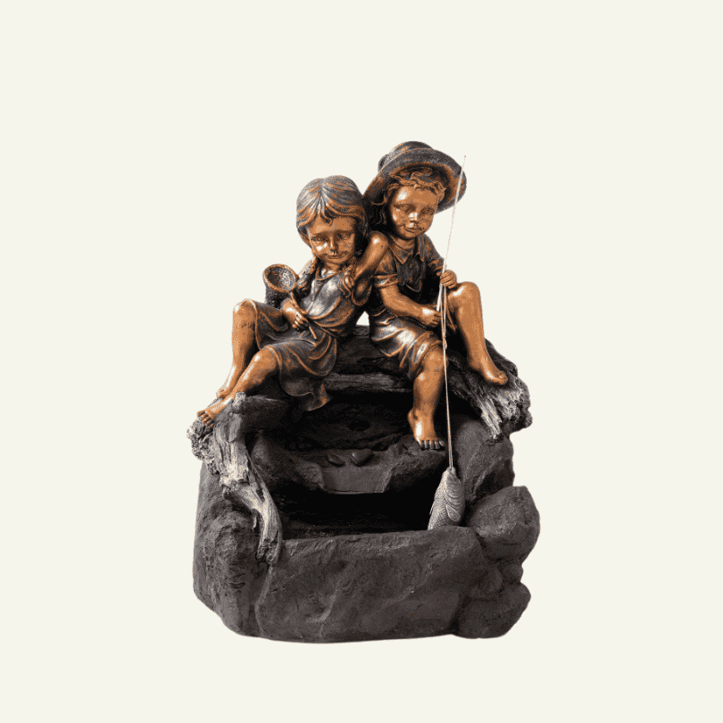 Una escena tierna y nostálgica toma vida en esta fuente decorativa. Bambini al Ruscello presenta a dos niños pescando, sentados sobre una formación rocosa que guía el fluir del agua. Esta pieza no solo embellece, sino que evoca dulces memorias de la infancia y juegos al aire libre.