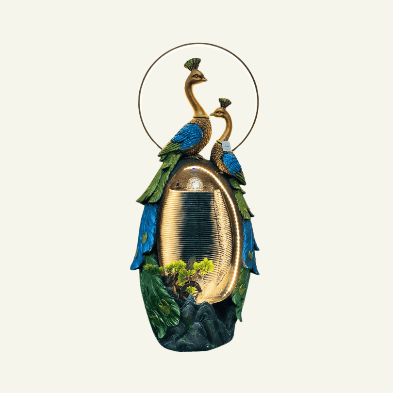 Un tributo al esplendor natural, la fuente Reali d’Acqua presenta una pareja de majestuosos pavos reales coronando una cascada iluminada en forma de óvalo. Su presencia imponente y su diseño lleno de simbolismo la convierten en una pieza central para espacios refinados y con alma.