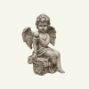 Estatua de ángel en actitud de oración, con rostro sonriente y sereno.